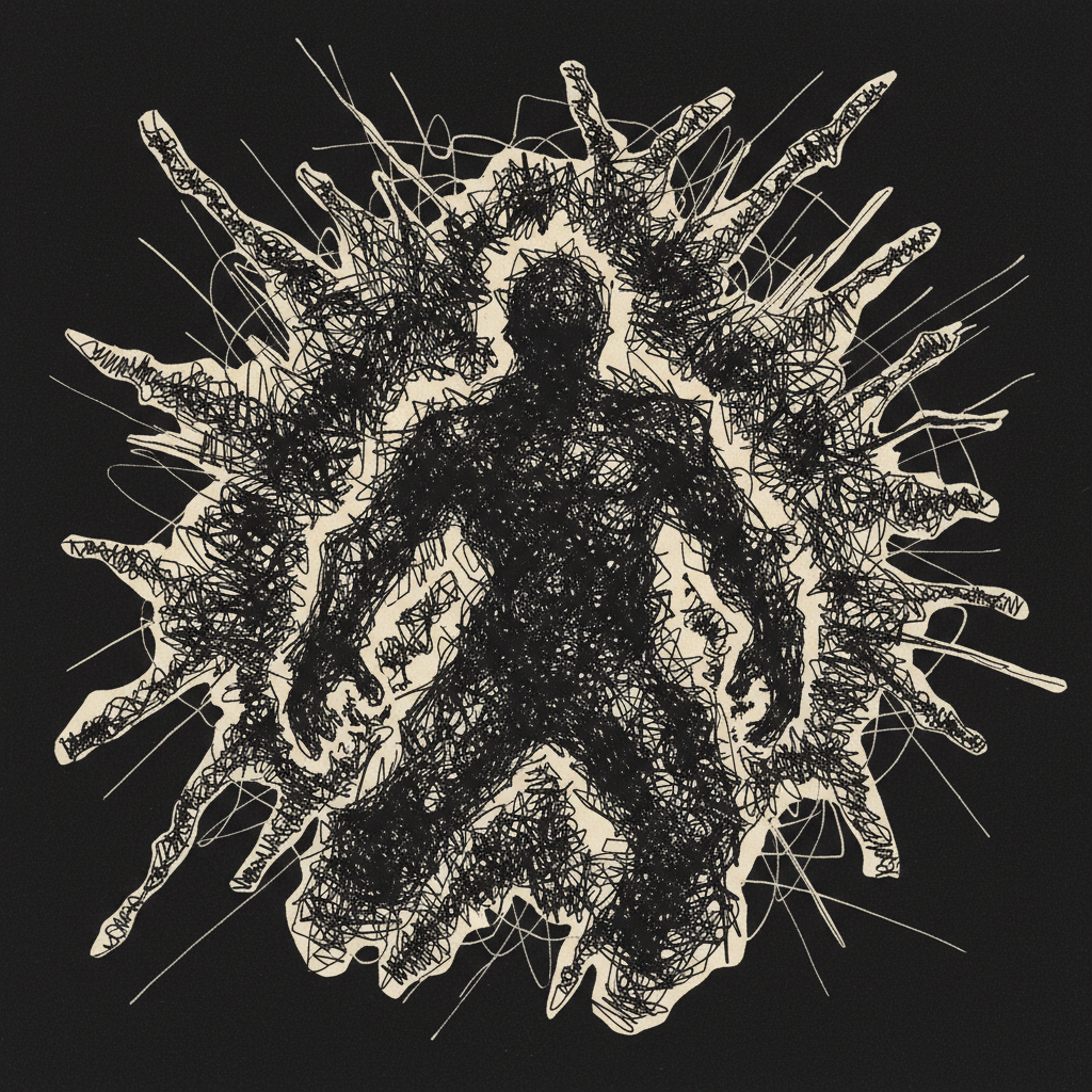 Chaotyczny plakat z ekspresyjnymi bazgrołami tuszem