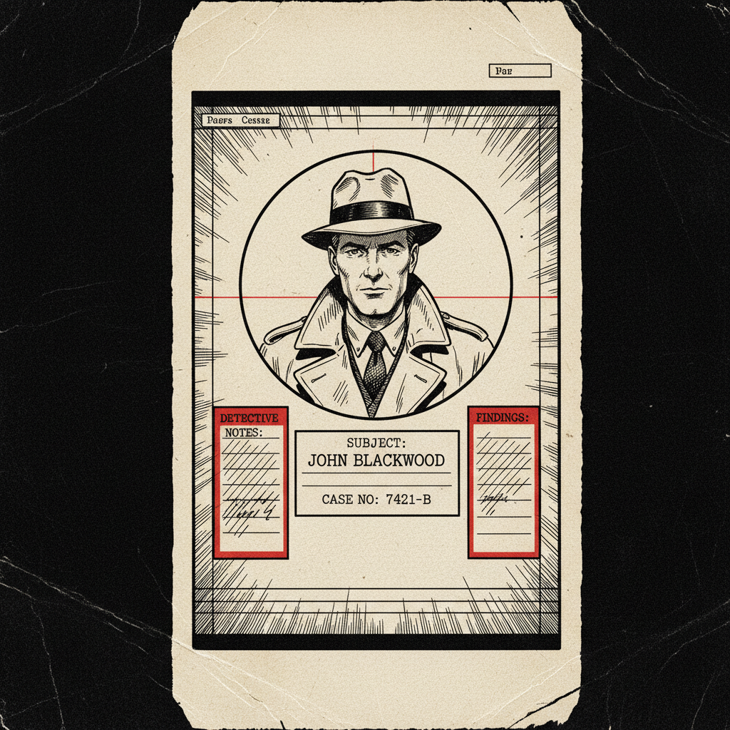 Wintage ilustracja kryminalistyczna tuszem z retro układem detektywistycznym